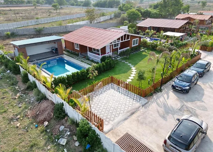 A Private Pool 3Bhk Wooden Cottage Moinabad Kuku Farm Stay dispõe de banheiro com banheiro separado e chuveiro. Secador de cabelo, lençóis de banho e toalhas estão incluídos para maior conforto.